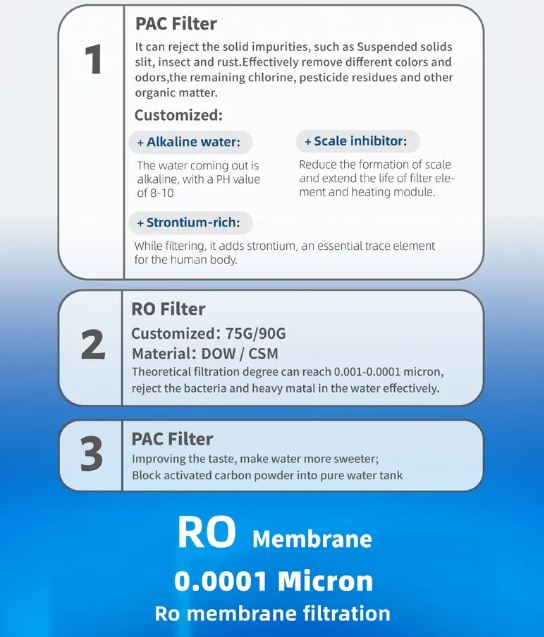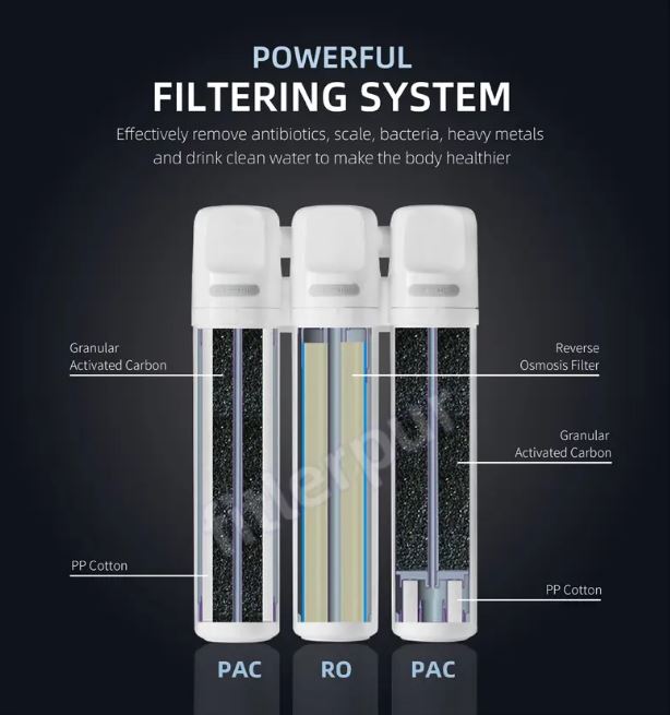 Filtrare avansată prin Osmoză Inversă până la 0.0001 microni — blochează bacteriile, virușii, metalele grele și alte substanțe dăunătoare.